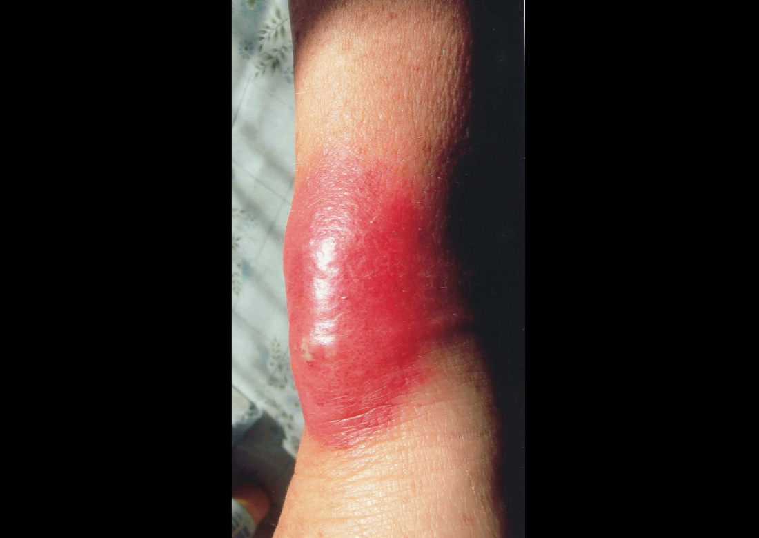 Bei dieser 48-jährigen Patientin – Grundkrankheit Granulomatose mit Polyangiitis – entwickelt sich über Nacht diese höchst schmerzhafte, überwärmte Veränderung – Diagnose?