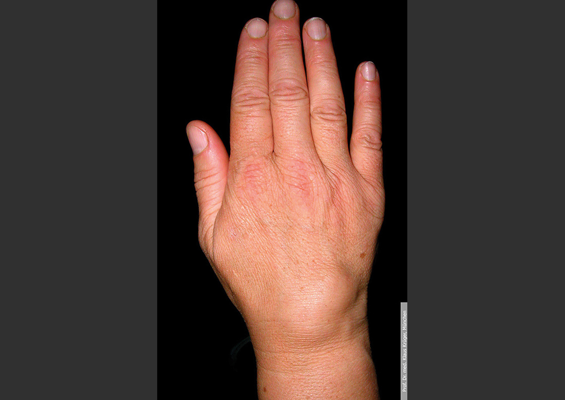 RICHTIGE LÖSUNG B – Bei Hämochromatose findet sich oft eine ausgeprägte Arthrose im Bereich der Fingergrundgelenke 2/3, die sonst bei der Fingerpolyarthrose eher selten betroffen sind
