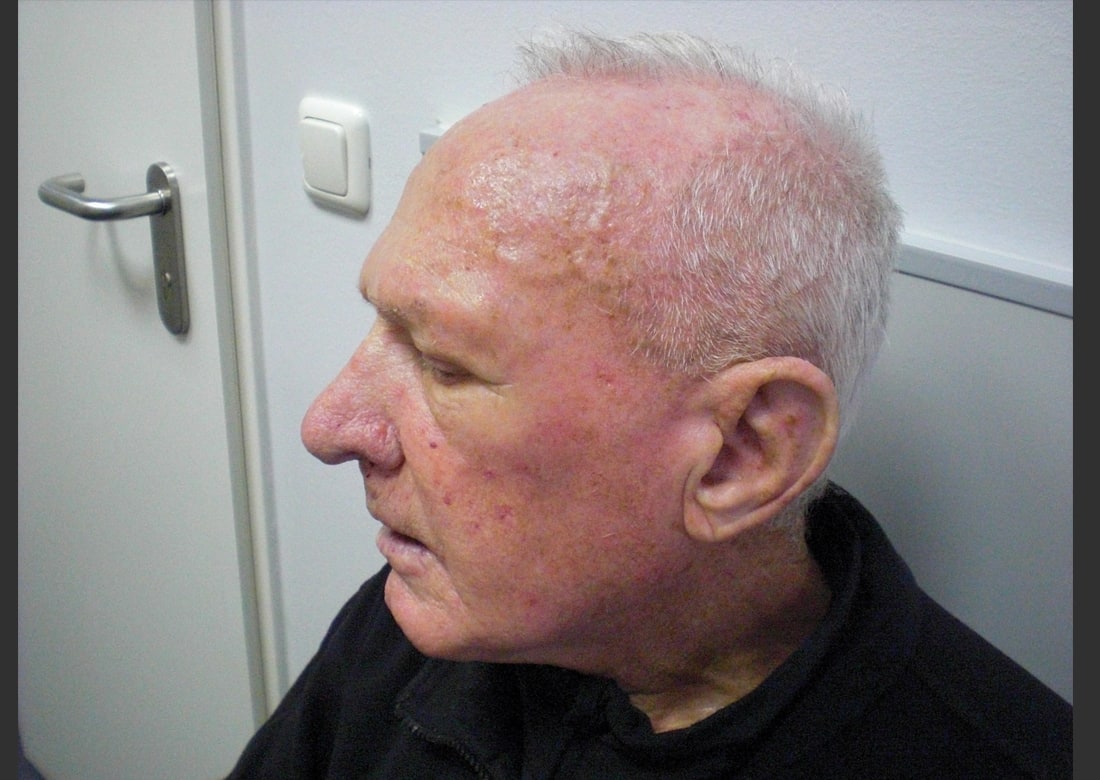 Wie nennt man die vorwiegend an den Wangen sichtbaren Hautveränderungen dieses 69-jährigen Patienten?